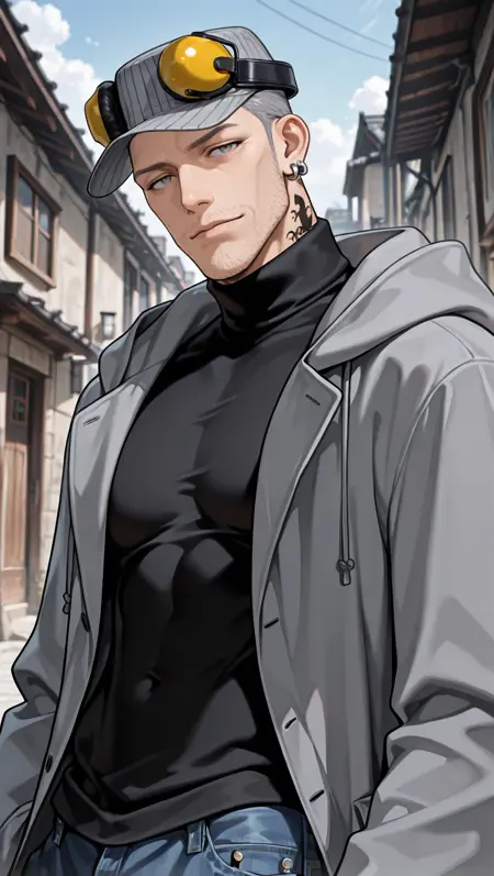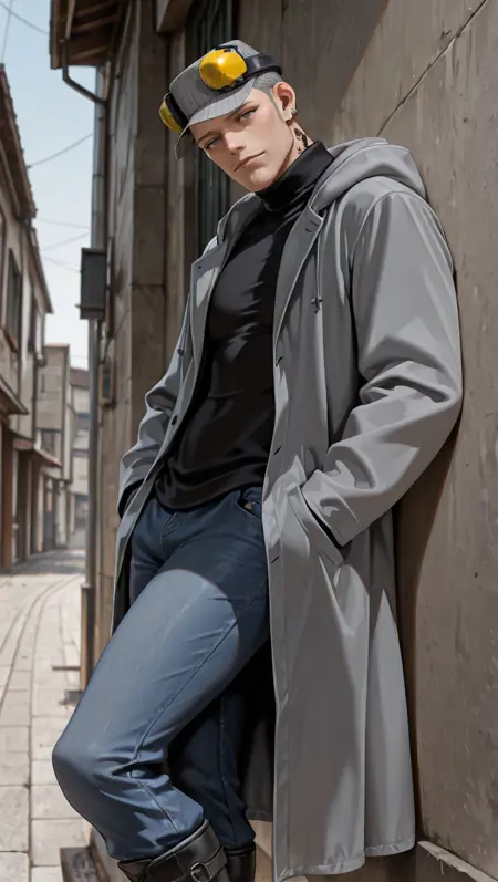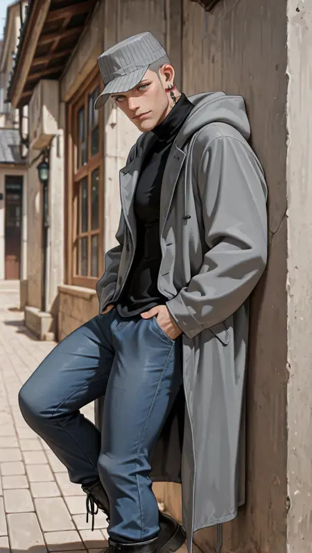 pinstripe hat, ear protection, black turtleneck, grey long coat, hood down, jeans, boots
