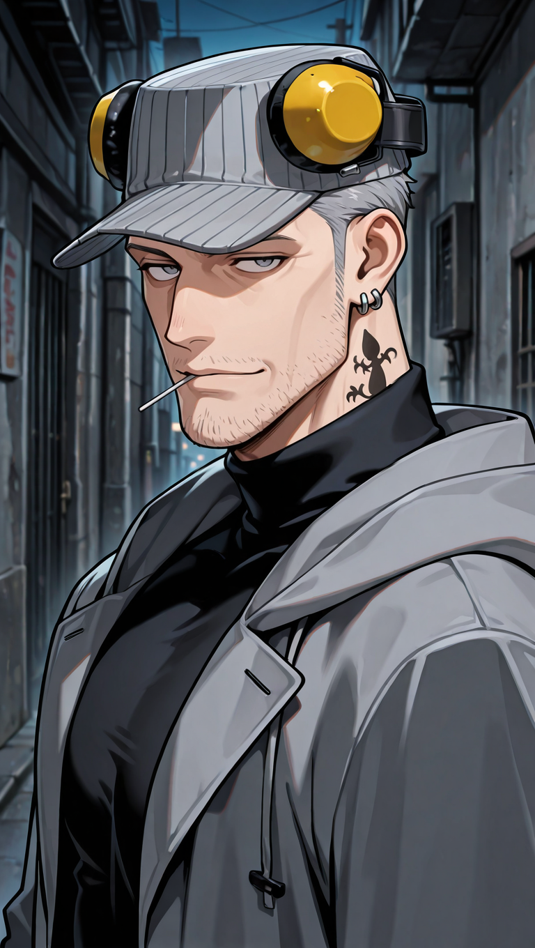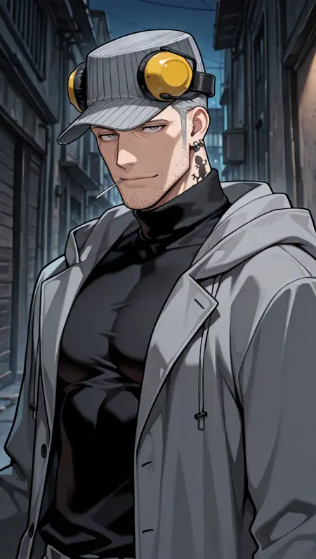 m_iwai, 1boy, mature male, grey hair, very short hair, grey eyes, long sideburns, stubble, neck tattoo