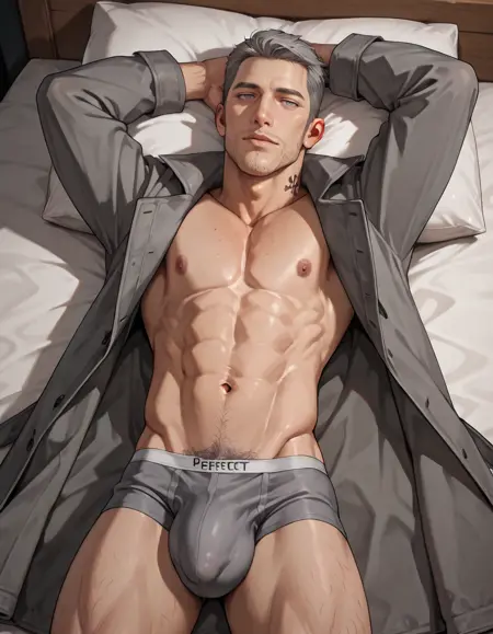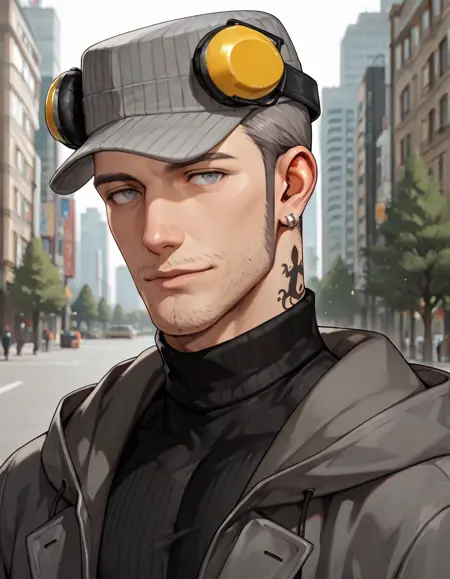 m_iwai, 1boy, mature male, grey hair, very short hair, grey eyes, long sideburns, stubble, neck tattoo
