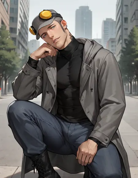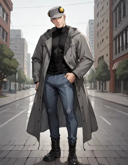 pinstripe hat, ear protection, black turtleneck, grey long coat, hood down, jeans, boots