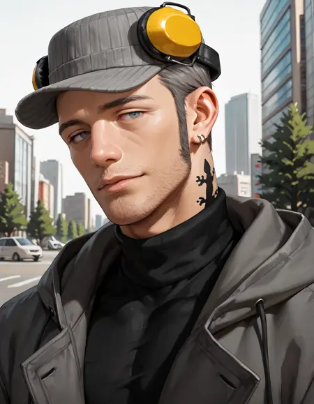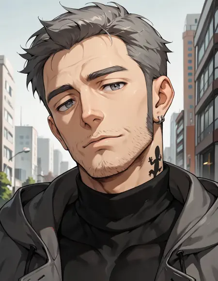 m_iwai, 1boy, mature male, grey hair, very short hair, grey eyes, long sideburns, stubble, neck tattoo