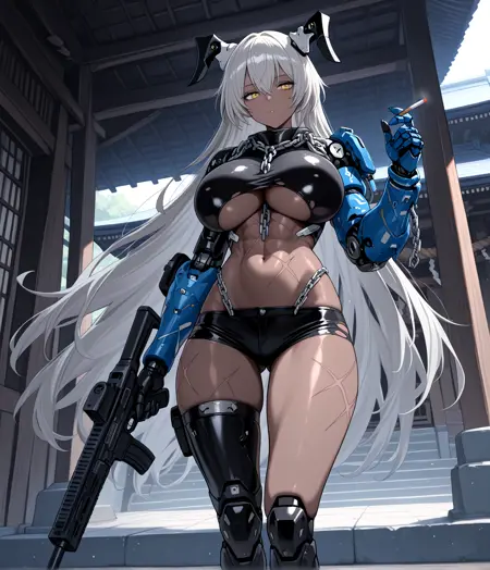 ASVIIII,yellow eyes,grey hair,hair between eyes,very long hair,large breasts, mechanical horns,chain,colored skin, dark skin, dark-skinned female,black shorts,underboob,scar on leg, scar on stomach, black asymmetrical mechanical legs,blue mechanical arms, large mechanical arm,torn clothes,abs,claws,