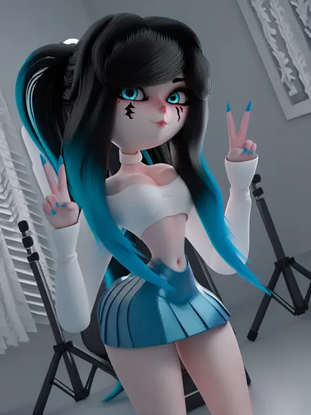 Harmony: "青い目、ミクロスカート、腹出し、クロップトップ、mizunoharmony、多色の髪、黒髪、アクア髪、長袖"