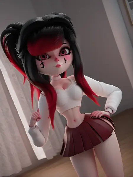 Melody: "赤い目、ミクロスカート、腹出し、クロップトップ、MizunoMelodyRed、多色の髪、黒髪、赤髪、長袖"