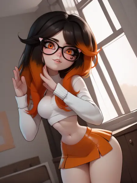 Symphony: "オレンジ色の目、ミクロスカート、腹出し、クロップトップ、mizunosymphony、多色の髪、黒髪、オレンジ髪、長袖、メガネ"