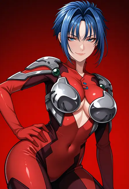 vlttPlt, 赤いパイロットスーツ, アンダークリヴァージ, アンダーブーブカットアウト, ボディスーツ, ショルダーパッド, 胸のアーマー, 銀色のアーマー,