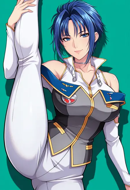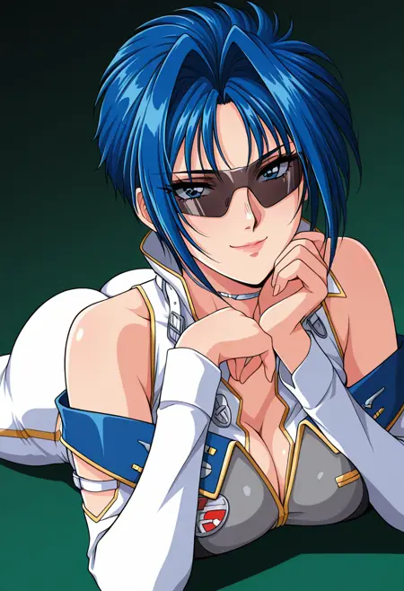 vlttDef, ユニフォーム, チョーカー, 高めの襟, 鎖骨, 肩出し, 白いシャツ, 灰色のベスト, 青いラペル, メダル, 白いズボン, 腕を組む, サングラス, 目隠し,