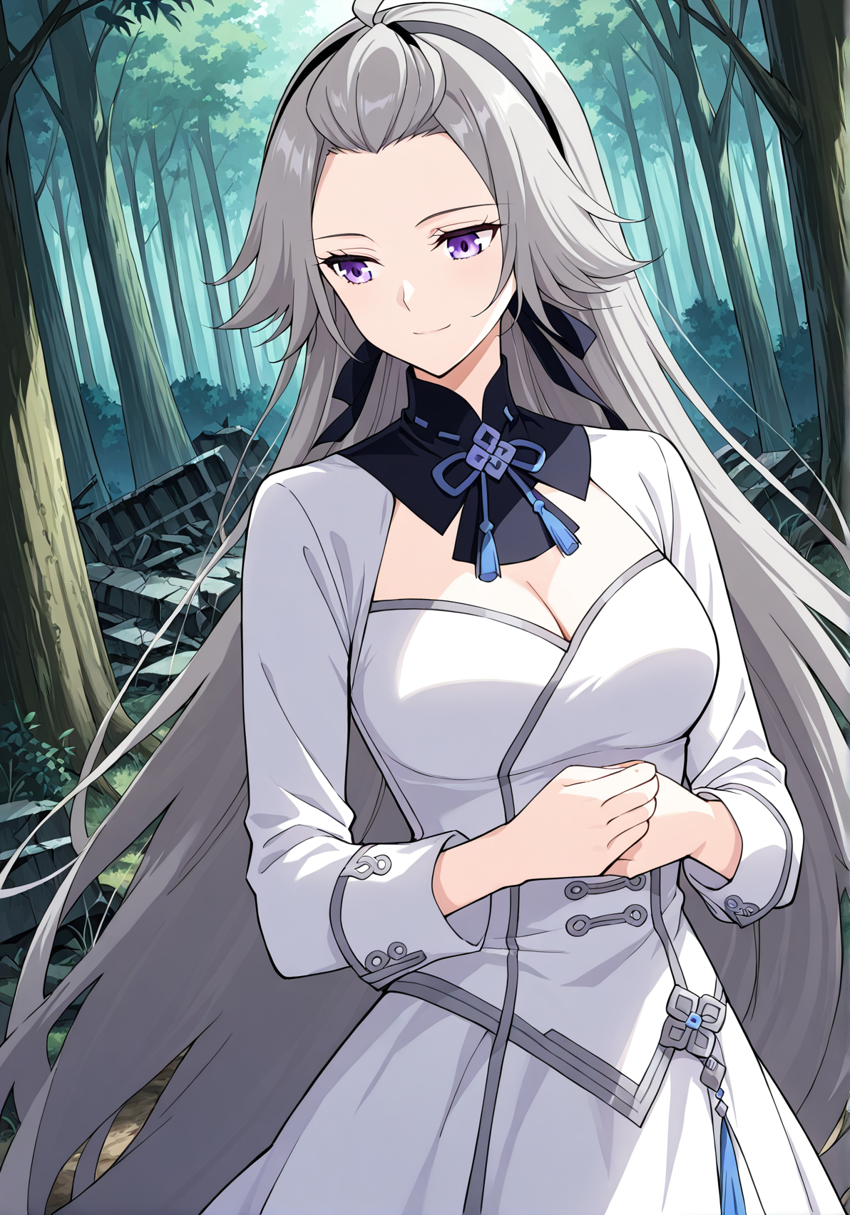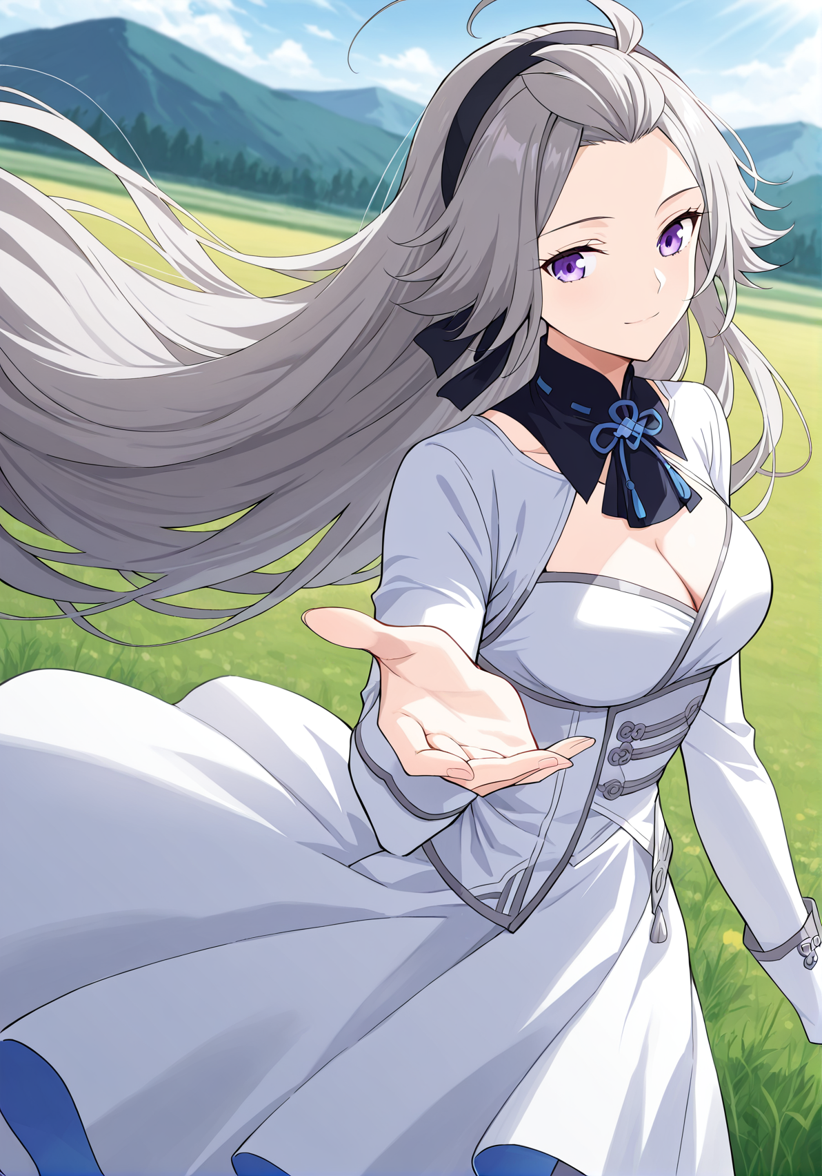 ahoge, white dress, long sleeves, black hairband, black knee boots, cleavage, blue ribbon, clothing cutout, cleavage cutout