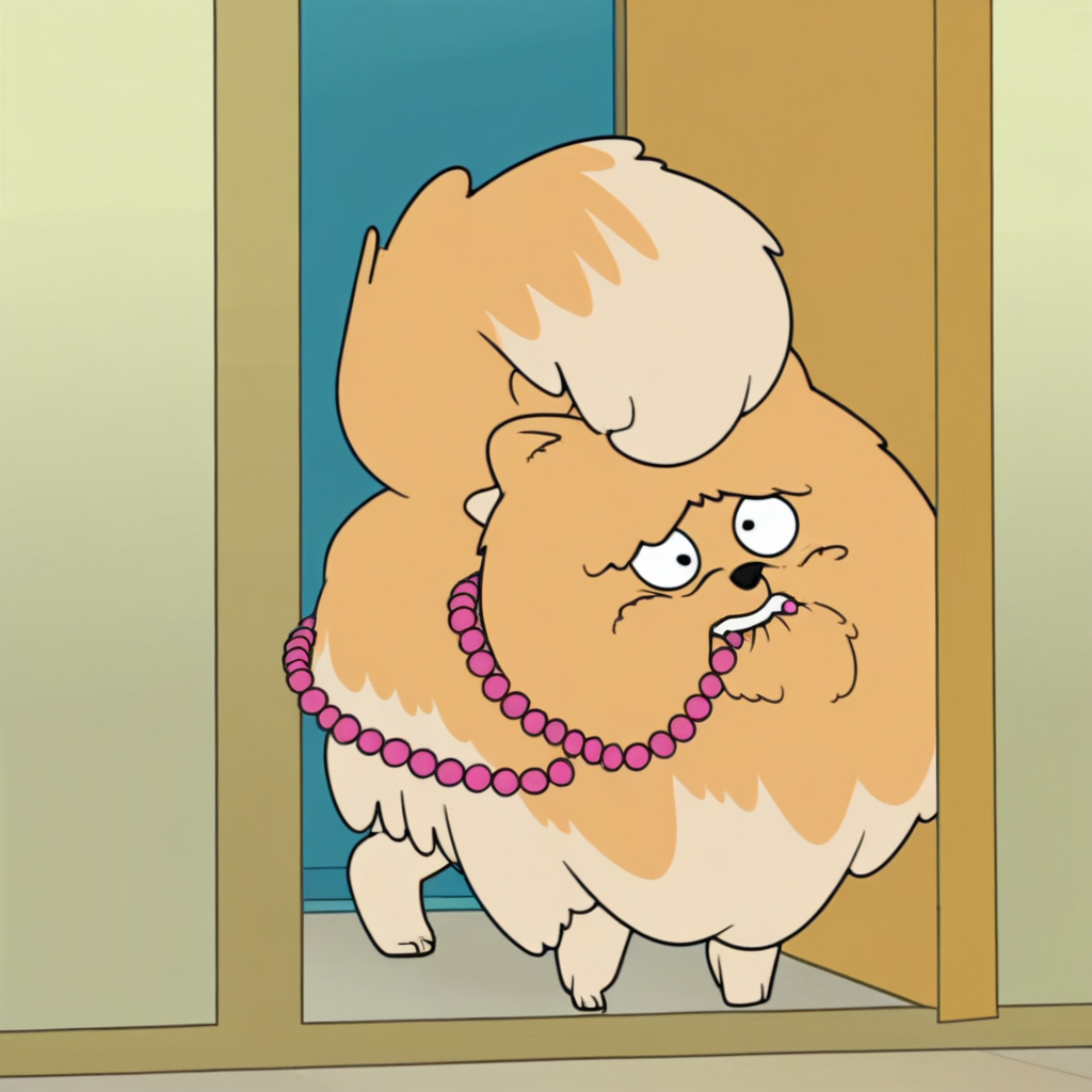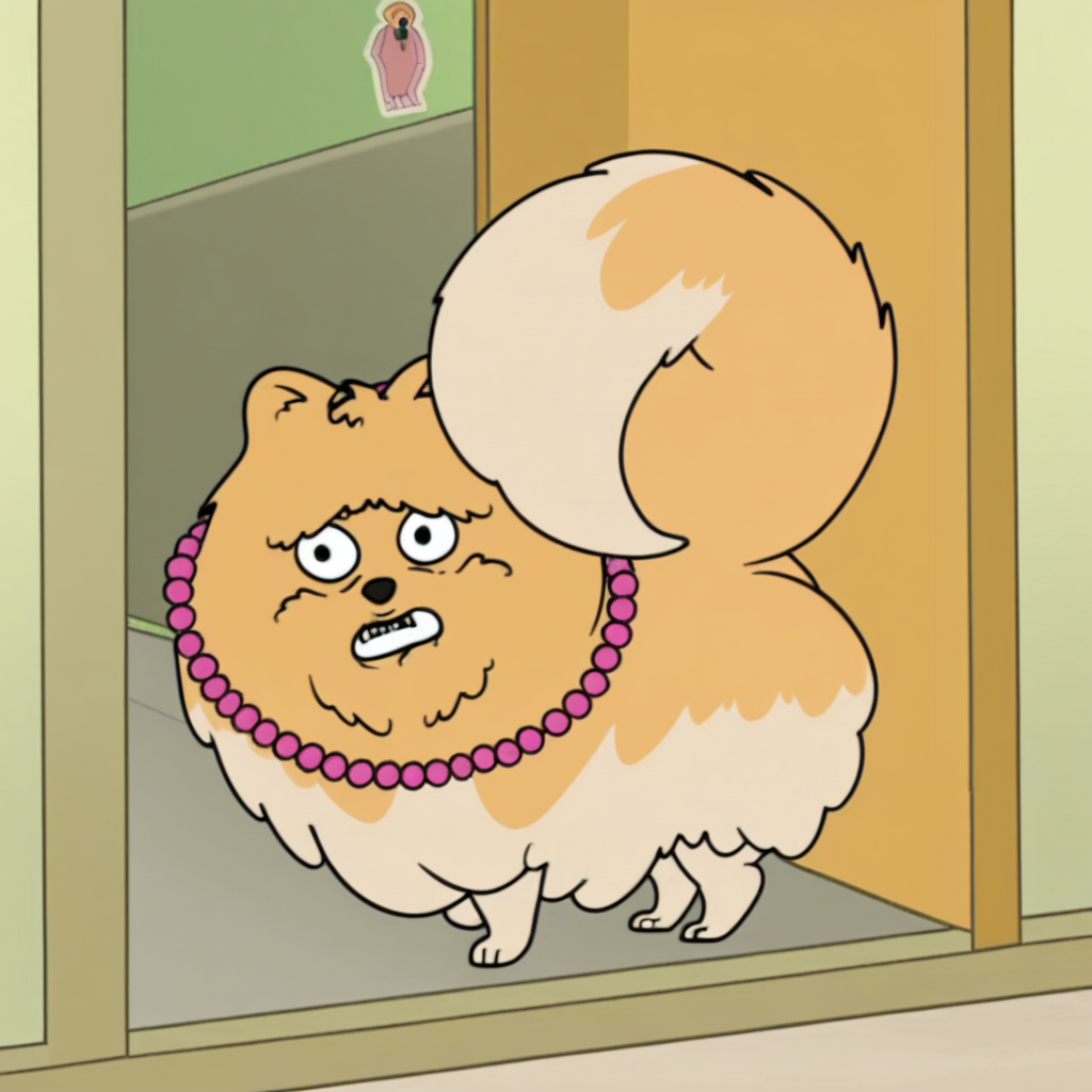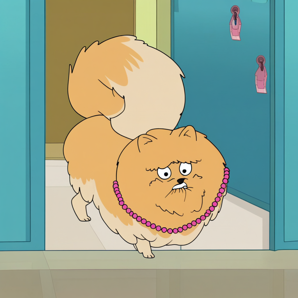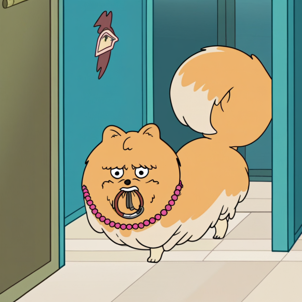 プロンプト: milly pomeranian, 野生的、屋内、パールのネックレス、ピンクのリボン、ロッカー、ドア、ドアを噛む、口で保持