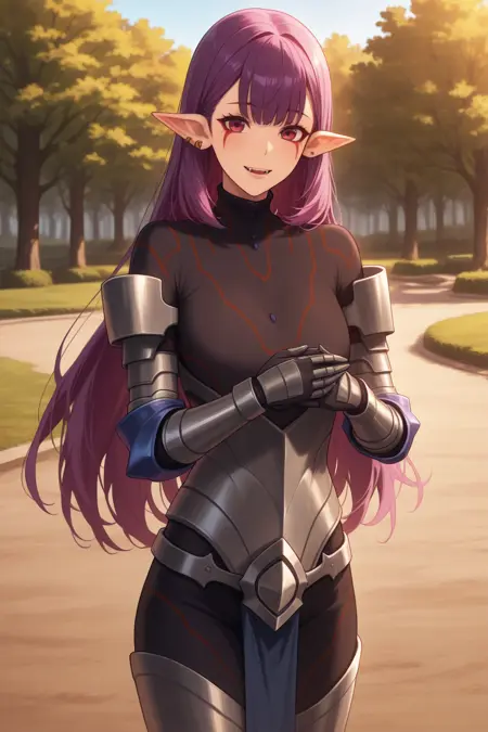 aaesil, 红色眼睛, 紫色头发, 尖耳朵, 面部纹路, 尖牙, 耳环, 盔甲, 灰色盔甲, 连体衣, 黑色连体衣, 手套, 铠甲靴,