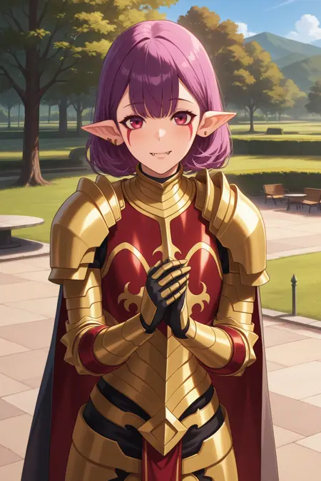 aaesil, 红色眼睛, 紫色头发, 尖耳朵, 面部纹路, 尖牙, 耳环, 全身盔甲, 红色盔甲, 金色盔甲, 肩甲, 护肩, 手套, 斗篷, 铠甲靴, 护胫,