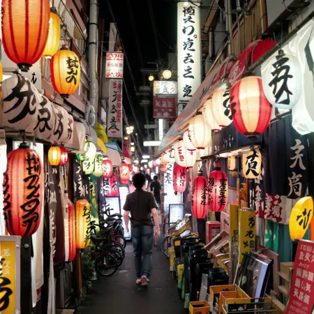 syonbenyokocho, street, japan, scenery, sign, light, night, ceiling light, traditional media, lantern, real world location, indoors, realistic, photo background, photo (medium)