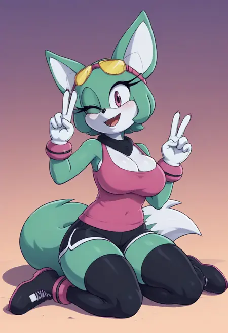Sonar the Fennec, fox girl, green skin, green fur, magenta eyes, big fox ears, green tail, purple shirt, black shorts, magenta shoes, magenta wristbands, yellow sunglasses on head, white gloves