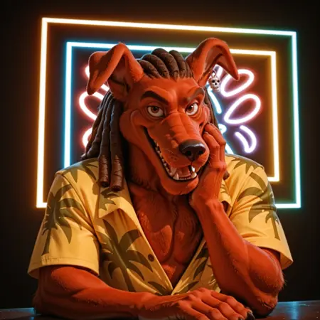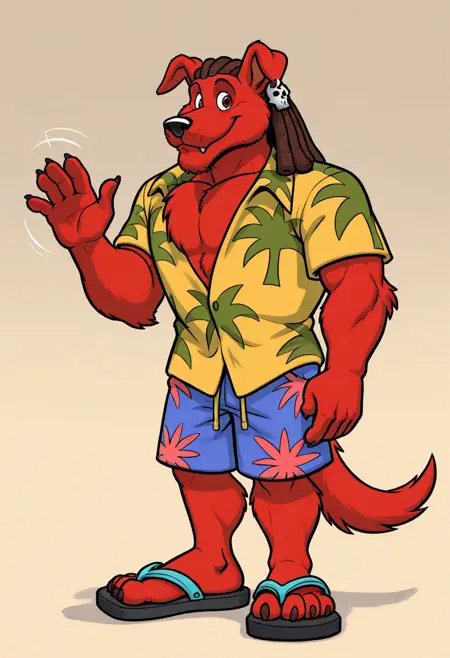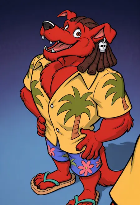 보조 태그로는 다음을 포함할 수 있다: "빨간 털, 빨간 몸체, 몸체 털, 갈색 머리카락, 드레드록스, 갈색 눈, 처진 귀, 송곳니, 긴 코, 손가락 발톱, 발가락 발톱"
