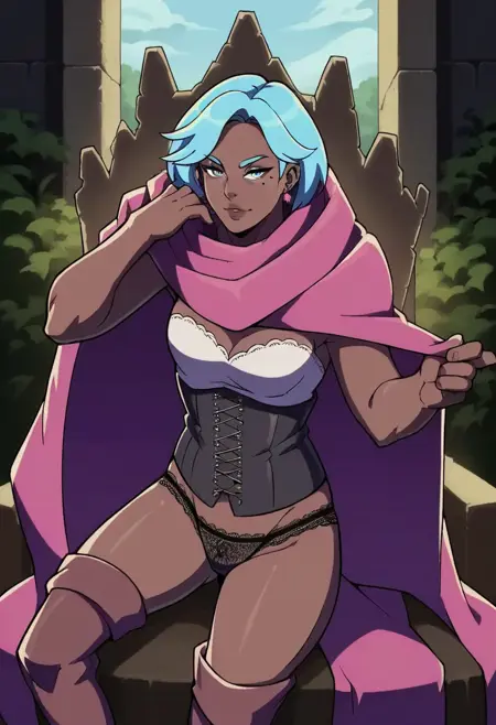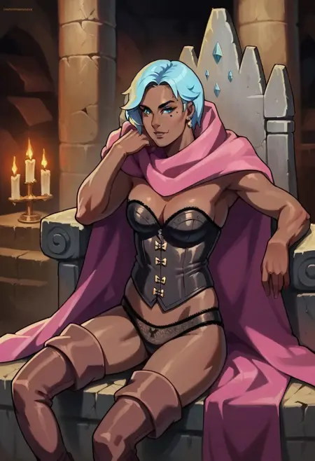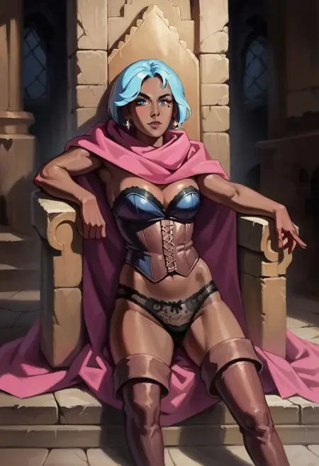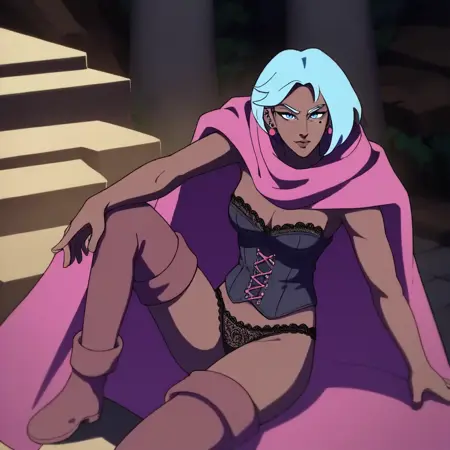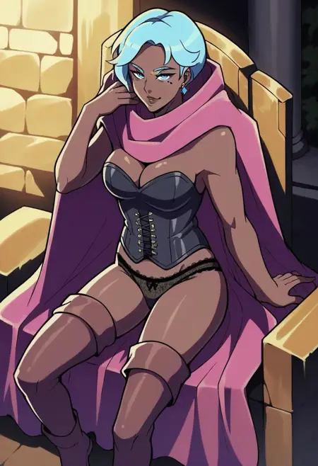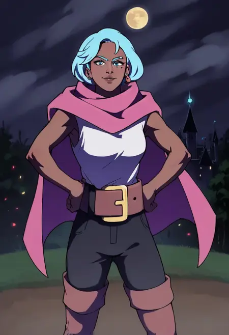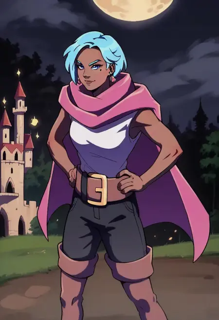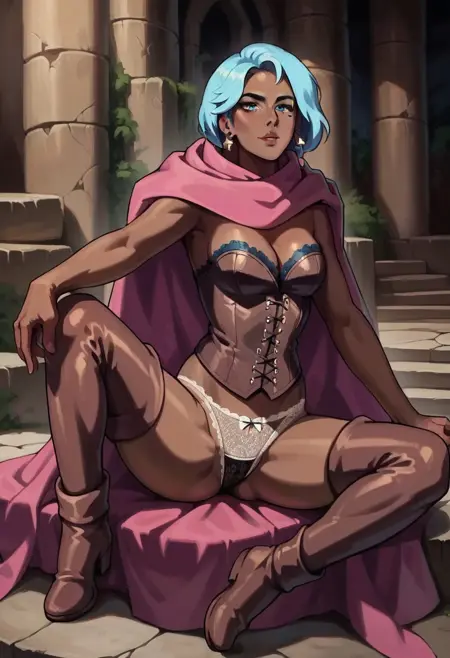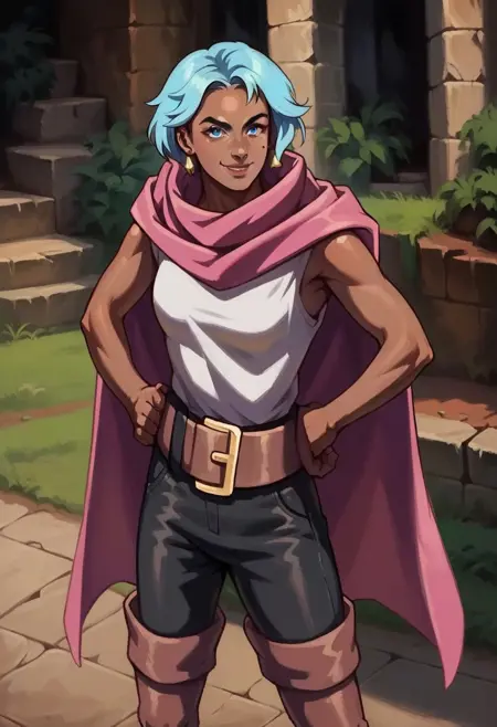 标签为:“Zi'Assunta_Belpaese、耳环、蓝发、短发、深色皮肤女性、蓝眼睛、眼下有痣”。服装为:“粉红色斗篷、白色衬衫、裸露手臂、腰带、黑色长裤、棕色大腿靴”。