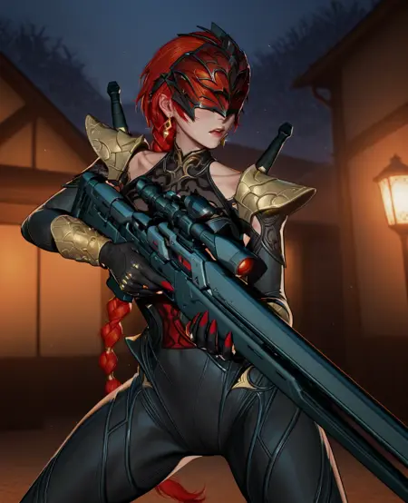 레드 런웨이 베일: R3dV31l, 1girl, 빨간 머리, 단발, 긴辫子, 파란 눈, 눈 가린, 마스크, 헬멧, 검은 바디수트, 갑옷, 장갑, 귀걸이, 하이힐