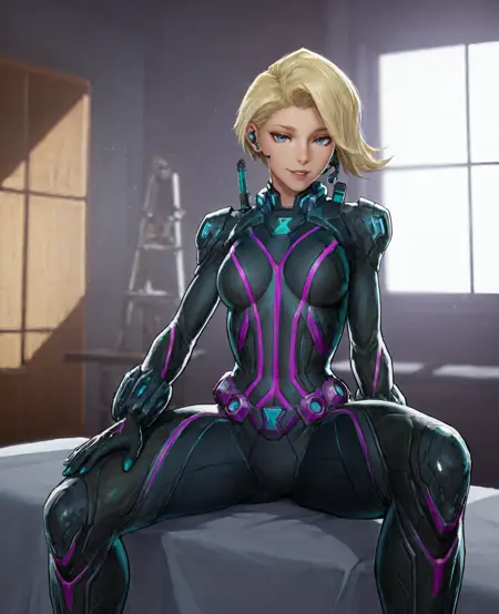 레탈 톡시시티: L3th4l, 1girl, 금발, 단발, 파란 눈, 이어피스, 검은 바디수트, 몸에 붙는, 네온 트림, 하이힐