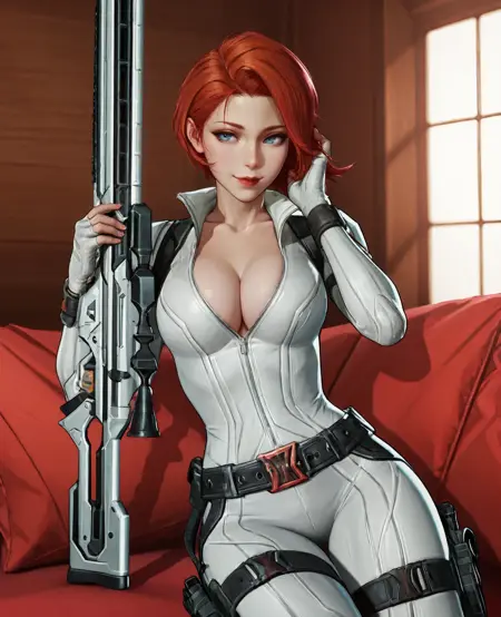 화이트 수트: Wh1t3, 1girl, 빨간 머리, 단발, 파란 눈, 빨간 입술, 흰 바디수트, 가슴 드러남, 검은 벨트, 손가락 없는 장갑, 부츠, 하이힐, 허벅지 홀스터