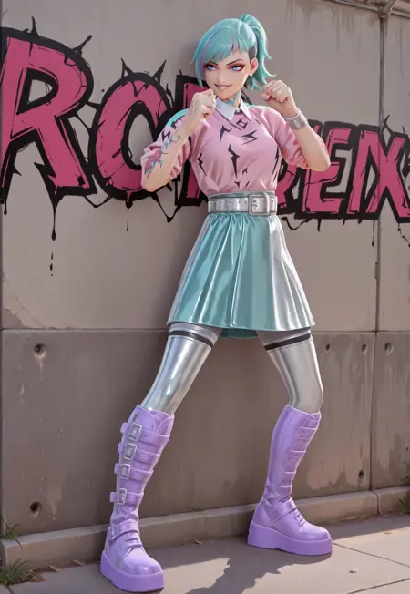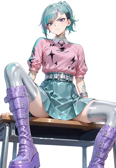 pink shirt, skirt, belt, silver thighhighs, knee boots, purple footwear, bracelet,