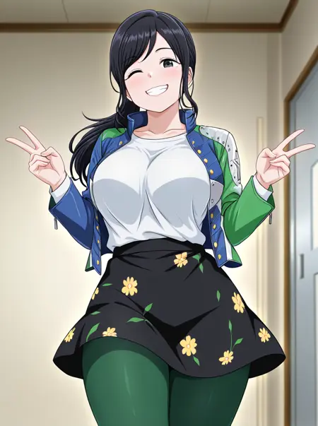 提示:1个女孩,夹克,黑发,黑眼,马尾,长发,衬衫,花卉图案裙,黑色裙子,绿色连裤袜,