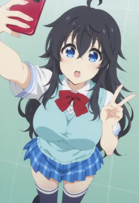 school uniform, sweater vest, white shirt, red bowtie, plaid skirt, blue skirt, black thighhighs,