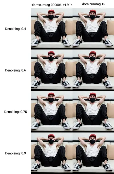 训练设置:768 分辨率,超过 500 张图片,每张图片训练 10 步,12 个不同文件夹/概念(共享“cumrag”概念),使用 AdamW 优化器。