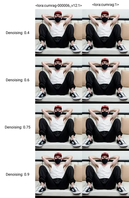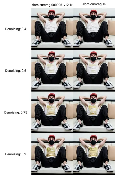 推荐:30 步,分辨率大于 1200px。去噪强度 0.28 用于减少纹理变化;0.45 用于获得更佳的污渍和衣物纹理,但若图像中包含过多身体部位(如腿部、肘部等),可能导致失真,请注意。面部效果则会非常出色。