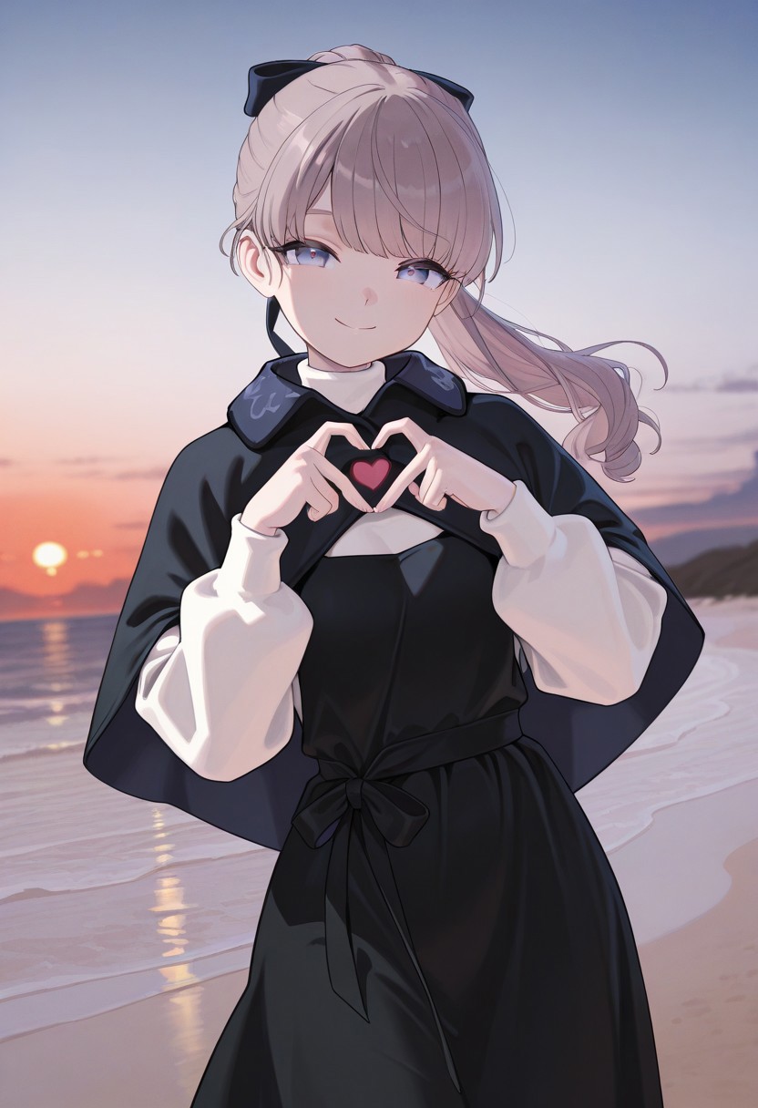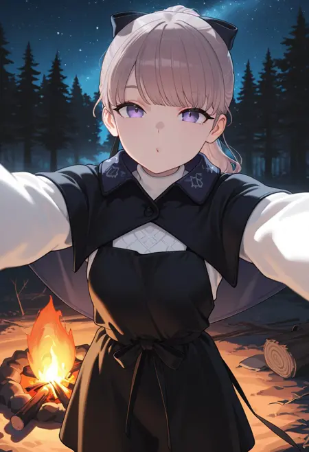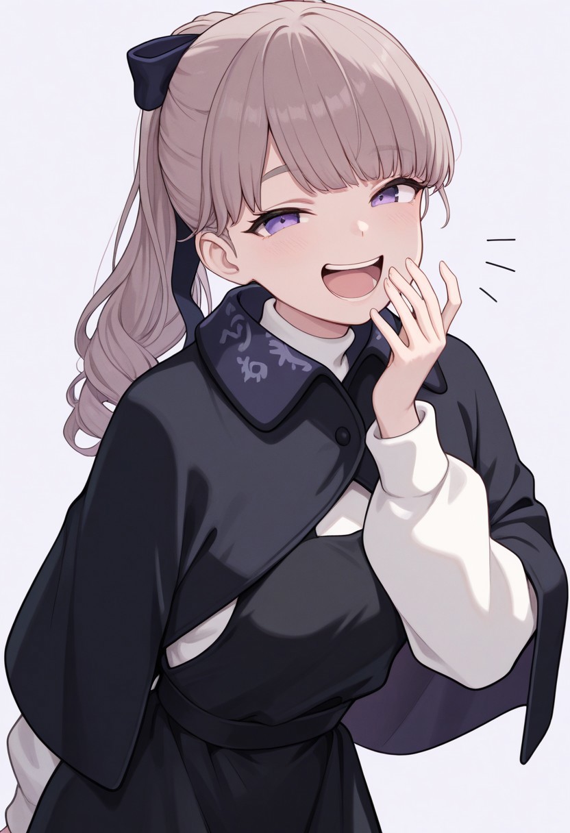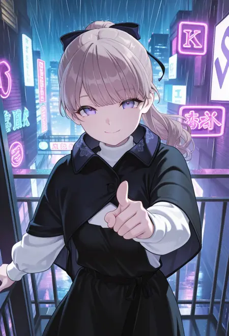 外見: 薄茶色の髪、紫色の目、ポニーテール、前髪、髪飾り、黒いカーディガン、黒いドレス、白いセーター、赤い靴下、膝丈靴下、黒い靴、