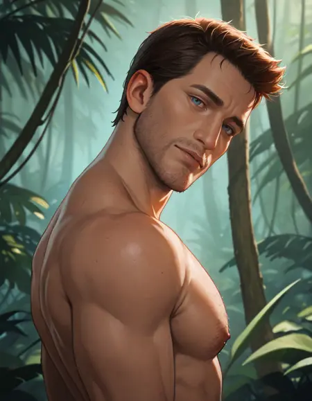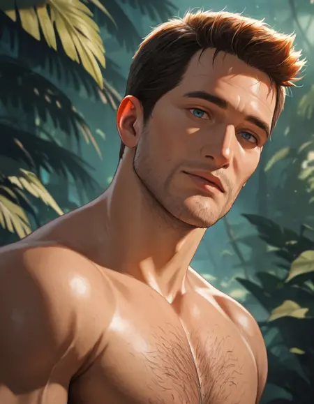 uncharteddrake, 1boy, mature male, very short hair, brown hair, blue eyes, stubble, sparse body hair