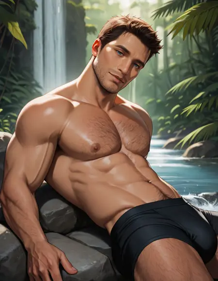 uncharteddrake, 1boy, mature male, very short hair, brown hair, blue eyes, stubble, body hair
