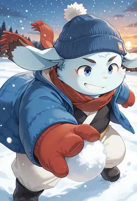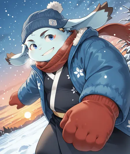 • winter_clothes, pom_pom_beanie, two-tone hat, red hat, blue hat, red_scarf, blue winter_jacket, black_yukata, red_mittens, yellow sash, white baggy_pants, black_boots,