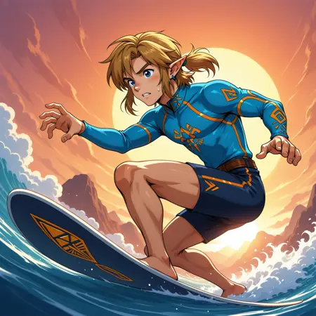 이 LORA는 서핑보드 위에서 전형적인 '서핑' 포즈를 취하는 인체형 캐릭터를 쉽게 생성하도록 설계되었습니다. 강도를 낮추면 비인체형 캐릭터의 품질 향상에 도움이 되며, 강도를 높이면 파도의 품질과 현실감 그리고 포즈가 향상되지만 캐릭터의 정확성과 애니메이션 스타일은 감소합니다. 학습 데이터셋의 특성상, 얼굴 품질 향상을 위해 IPadapter를 사용하고, 해상도 스케일 1.5에서 R-ESRGAN 4x+ Anime6B를 사용한 하이레졸루션 고정을 추천합니다.