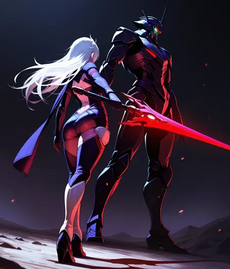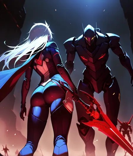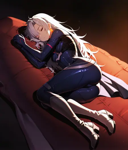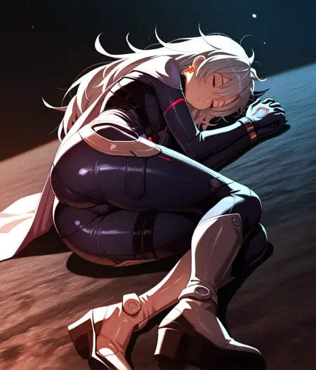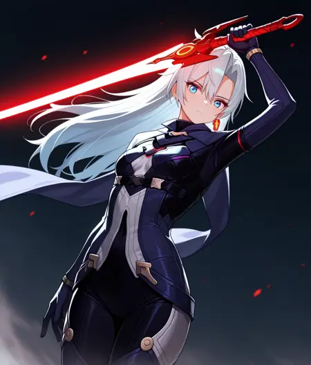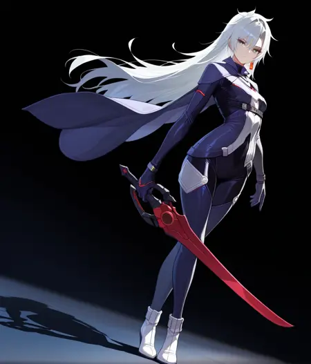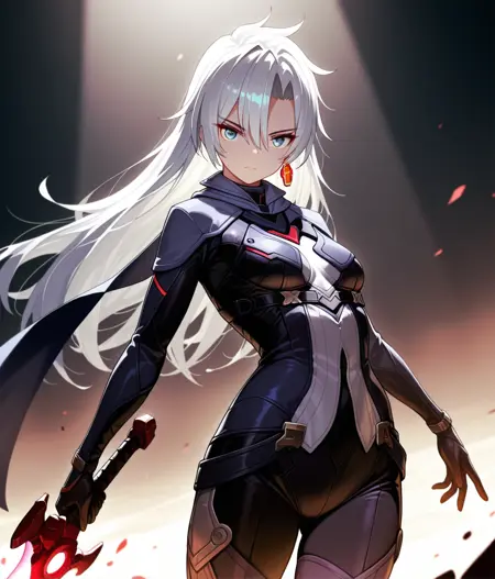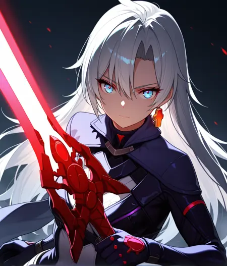 옷차림: 파란 눈, 긴 머리, 어수선한 머리, 하얀 머리, 회색 머리, 가슴, 한쪽 귀고리, 갑옷, 진한 파란 슈트, 장갑, 망토, 조종복