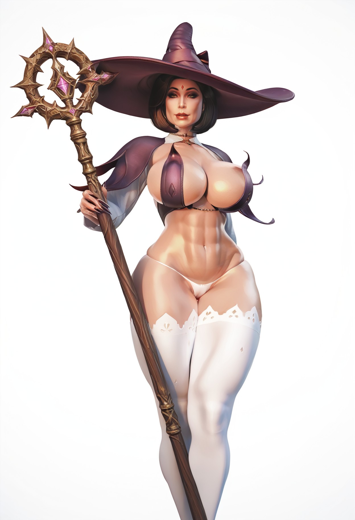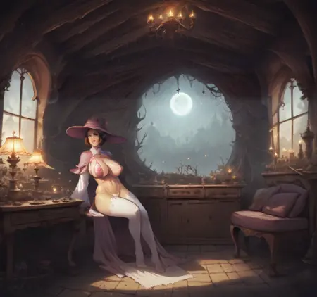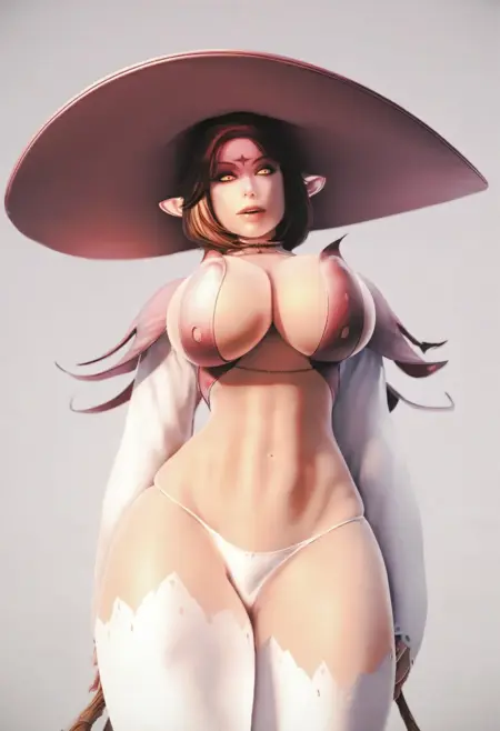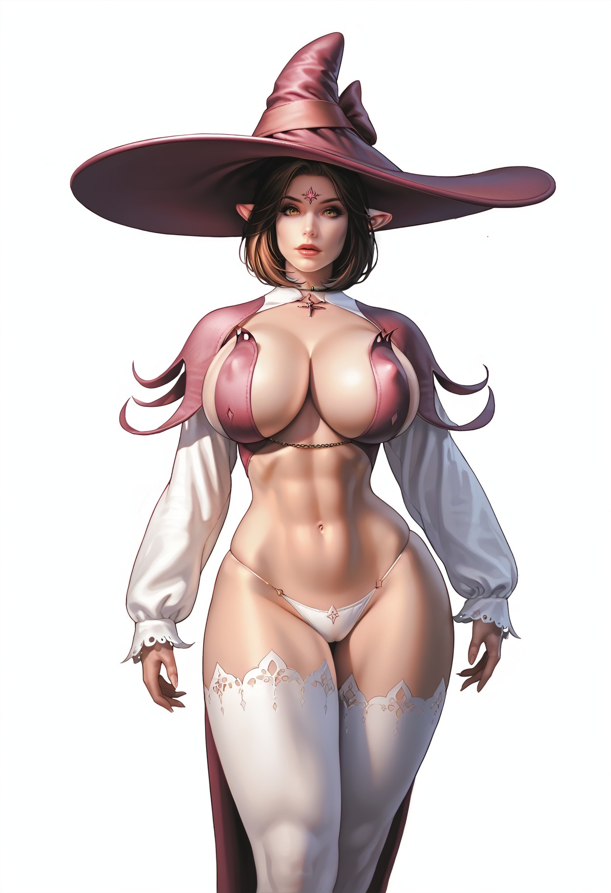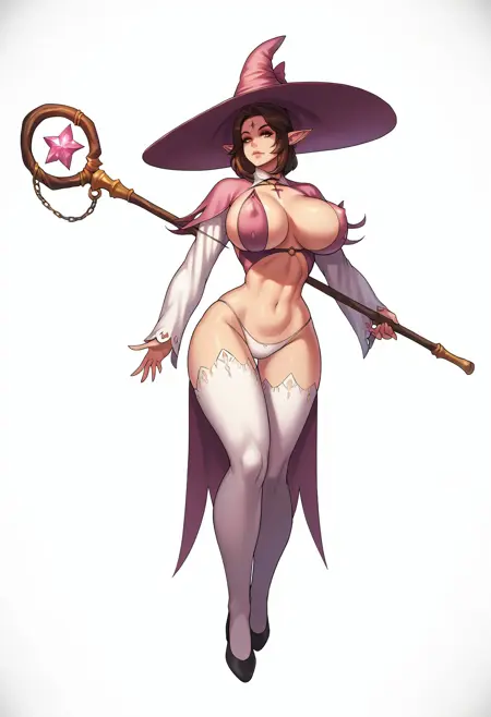 트리거는 _shadowwitchfinery_이며, _elf, pink bra, pink shrug (clothing), white thong, white thighhighs, navel, pink witch hat, brown hair_를 사용하면 기본 외모를 얻을 수 있습니다.