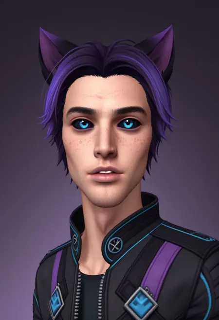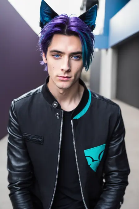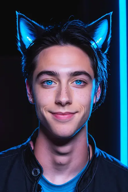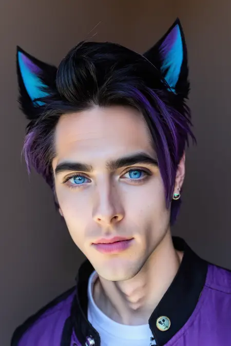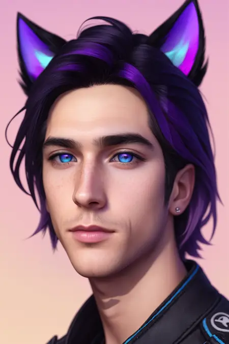 그는 검은 머리카락을 가진 고양이 소년이며, 귀엽다.