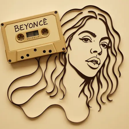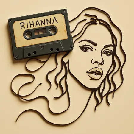 Decossette 아트 스타일, "#text" 텍스트가 있는 빈티지 스타일의 카세트, 카세트에서 자석 테이프가 나와 있으며, 자석 테이프만으로 #shape의 윤곽을 형성, 사실적인 자석 테이프 질감, 자석 테이프 개념 예술, 고해상도 사진, #shape는 자석 테이프만으로 구성됨