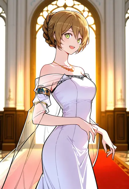 folded braid, white dress, collarbone, bare shoulders, sleeveless, armband, see-through cape, tight dress, jewelry, necklace,