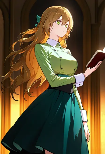 Raeliana Macmillan, brown hair, long hair, light green eyes,