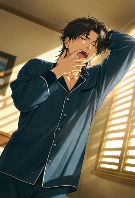 分层刘海,头发垂下, - 另一种发型!在负面提示中加入 头发向后梳 可以提升一致性!我私下更喜欢这种风格,而不是他原本的造型