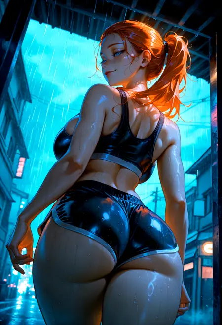 1girl, lips, freckles, blue eyes, orange hair, long hair, wide ponytail, hair pulled back, huge breasts, wide hips, (thick thighs:1.2),