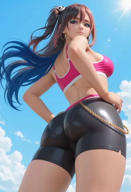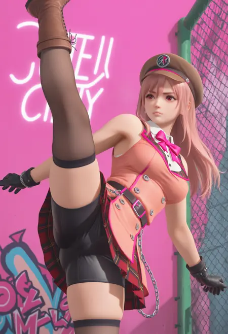 ofneonpop、ブラックチョーカー、ジッパーを開けたブラックフィッシュネット短めのフード付きジャケット、パープルのフード、フードを下ろした状態、肩のカットアウト、ジッパー、ホワイトハルターネックの短めのトップ、胸元のカットアウト、アンダーブーブのカットアウト、片方のブラックフィンガーレスグローブ、グローブチェーン、ゴールドの肘ストラップ、片方のパープルの取り外し式肘袖、ホワイトストライプの腕バンド、ブラックベル、ピンクのベルトバックル、非対称なフィッシュネットパンツ、ヒップのカットアウト、片方のブラック太ももパック、パンツのパッチ、Oリング太ももストラップ、パープルストライプのパンツストラップ、マルチカラーのハイカットスニーカー、ダークブルーの靴ひも、