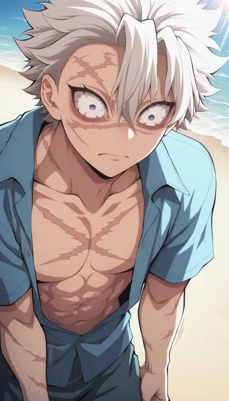 1boy, male focus, sanemi shinazugawa, short hair, white hair, bloodshot eyes, scar on face, scar on forehead, scar on arm, scar on chest,