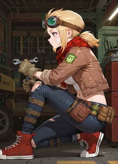 衣装: 頭にゴーグル、顔に包帯、赤いスカーフ、チェック柄のスカーフ、茶色のジャケット、レザージャケット、開いたジャケット、白いショートトップ、茶色の手袋、ベルト、ポーチ、ジーンズ、破れたジーンズ、膝あて、赤い靴、赤いシューズ、