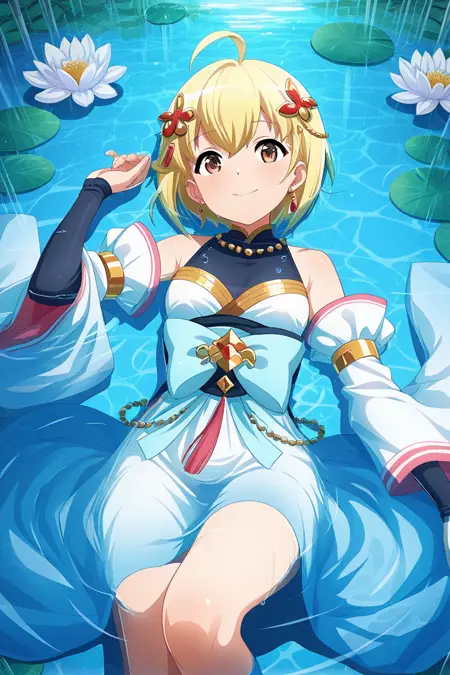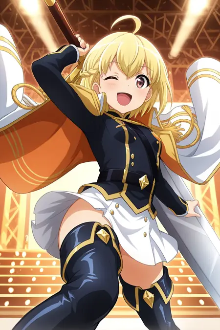 michiru, 1girl, blonde hair, epaulettes, solo, ahoge, looking at viewer, uniform, smile, skirt, military uniform, short hair, braid, military, jacket, white skirt, aiguillette, brown eyes, double-breasted, jacket on shoulders, buttons, stage outfit
