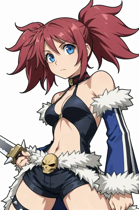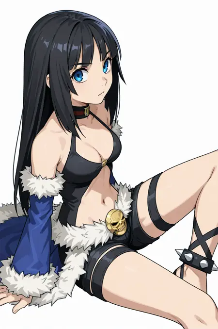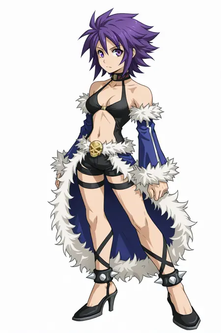 프롬프트: stalkerRO, 검은 짧은 반바지, 모피 트림, 분리형 소매, 배꼽, 드러난 어깨, 목걸이, 파란색 허리 망토, 할터넥, 두개골, 허벅지 스트랩, 다리 스트랩, 발목 스파이크, 하이힐