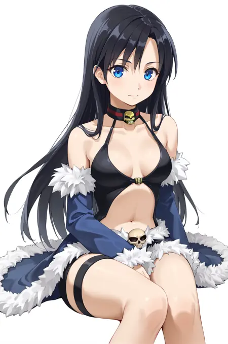 프롬프트: stalkerRO, 검은 짧은 반바지, 모피 트림, 분리형 소매, 배꼽, 드러난 어깨, 목걸이, 파란색 허리 망토, 할터넥, 두개골, 허벅지 스트랩, 다리 스트랩, 발목 스파이크, 하이힐