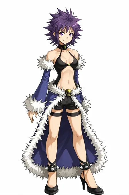 프롬프트: stalkerRO, 검은 짧은 반바지, 모피 트림, 분리형 소매, 배꼽, 드러난 어깨, 목걸이, 파란색 허리 망토, 할터넥, 두개골, 허벅지 스트랩, 다리 스트랩, 발목 스파이크, 하이힐