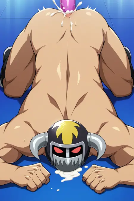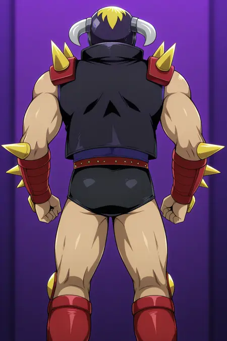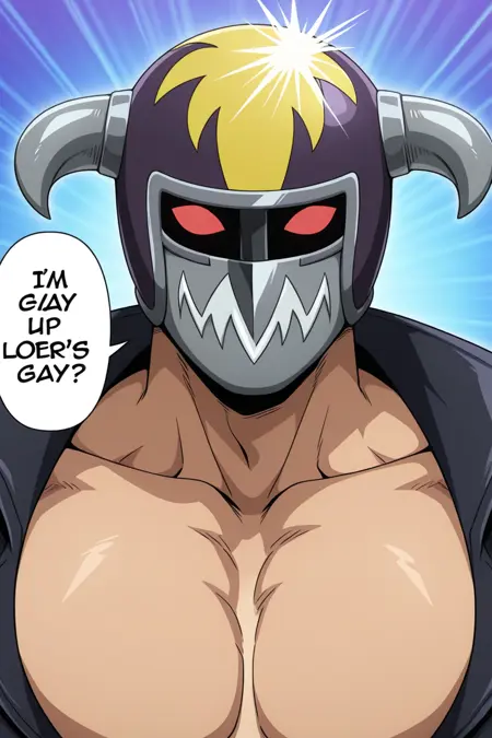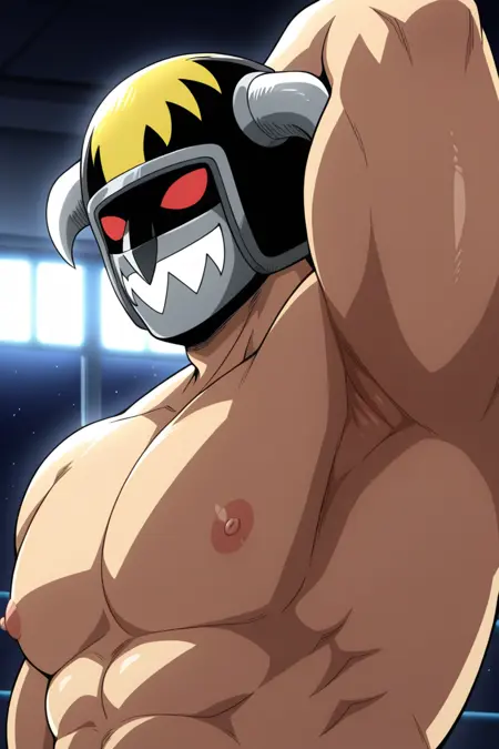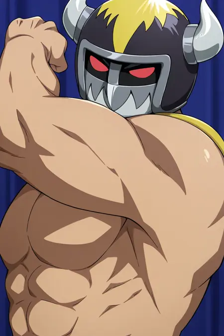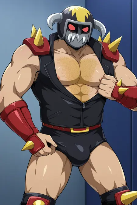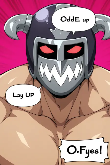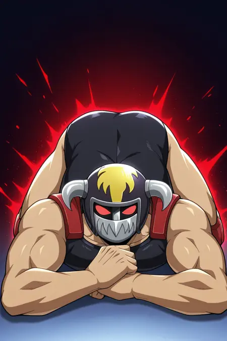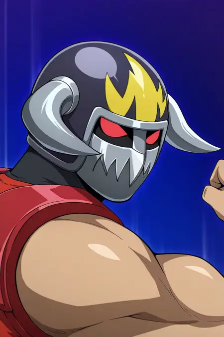 | トレーニングワード | Yosh Imimi, solo, male, red eyes without pupils, wrestler-style helmet, two metal side horns, mandible-style mask with metal teeth, sleeveless black vest, sleeveless purple shirt, red shoulder pads and yellow spikes, red wrist guards, red belt, black trunks, long red boots, knee protectionコピーしました! |
