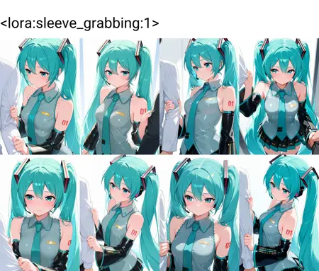 LoRA는 "1girl, sleeve grab" + "1boy, out of frame" 조합에 대해 모델이 더 잘 이해하도록 돕습니다. 이 개념은 소녀가 붉은 얼굴로 부끄러운 표정으로 무언가를 고백하려 할 때, 소년의 소매를 잡고, 소년은 이미지 프레임 밖에 완전히 벗어나 있으며, 이미지에는 그의 손이나 소매의 일부만 보이는 장면을 위해 설계되었습니다.