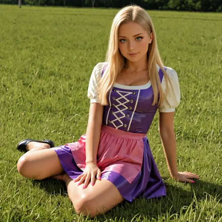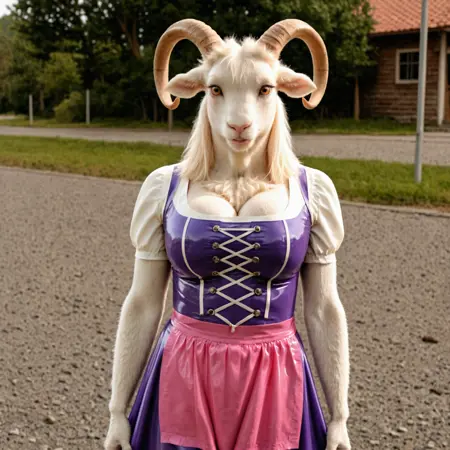 latex dirndl, purple clothing, pink apron